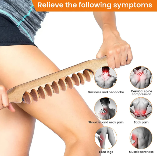 This wooden massage tool is designed for wood therapy (maderotherapy) to support lymphatic drainage, improve circulation, and help contour areas such as the thighs, waist, hips, and arms. Crafted from solid natural wood, it allows firm, controlled pressure to target tense muscles and fibrous tissue, helping improve skin appearance and overall body tone. When used with massage oil, it glides smoothly over the skin, making it ideal for regular body sculpting, relaxation, and skin-texture care routines.